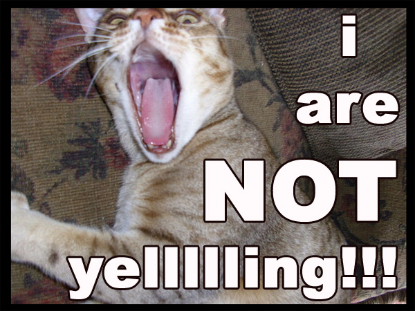To create our LOLcat, we flipped through some photos of our own kitties, Sotheby and Trillian. As it turned out, Bailey had taken a perfect photo of Sotheby. So, we put that up on the screen and spent a few minutes coming up with various captions. In the end, we selected Wendi's contribution, and then we all took a few minutes to ensure that it was appropriately grammatically incorrect. In the end, our LOLcat was as follows: